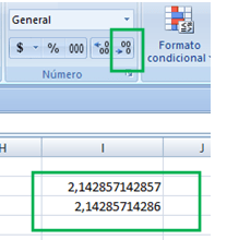 En las versiones de escritorio de excel, puede crear reglas decimales personalizadas para los distintos tipos de números incorporados utilizando el cuadro. Si pulsamos la opción disminuir decimales (flecha derecha) nos quitará un decimal y aproximará o redondeará el valor a 3,13.